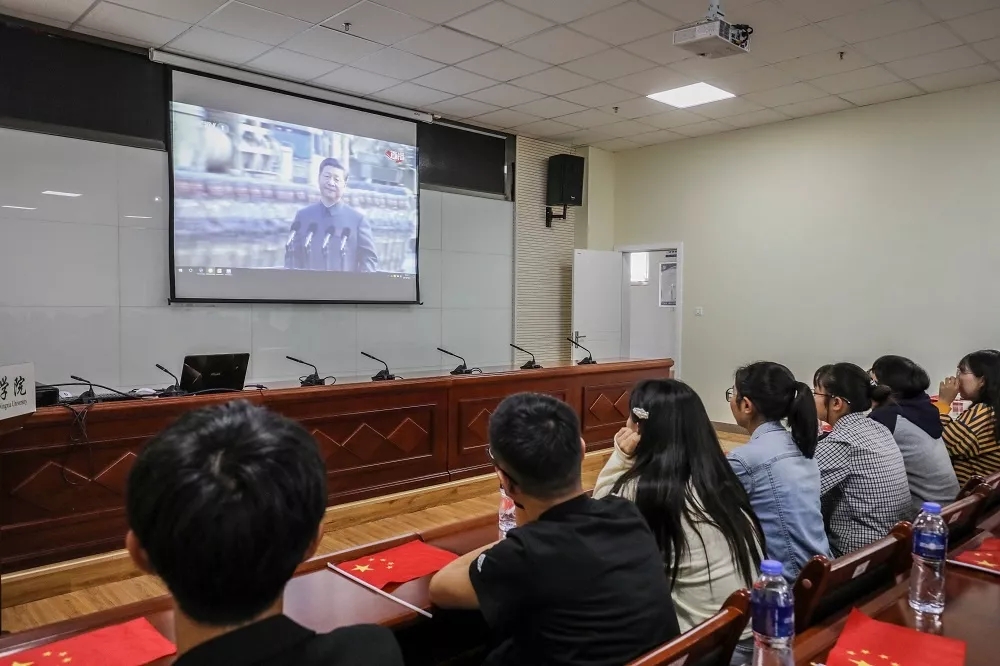 在观看直播过程当中,我们就观看阅兵式的感想进行了采访,接受采访的同学说:生活在新时代的新中国,我们感到骄傲和自豪,我们愿尽自己最大的努力为实现伟大中国梦、“两个一百年”奋斗目标奉献力量。