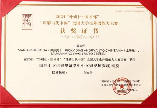 12月,由北京外国语大学和北京语言大学联合主办、外语教学与研究出版社承办的2024“理解当代中国”来华留学生中文短视频大赛全国总决赛又传喜讯,印度尼西亚留学生许燕美(MARIA CHRISTINA)、金予程(RICKY DIAS ANDRYANTO CHINTAMA)和2021级汉语言文学专业本科生刘伟龙(MUHAMMAD WAGIYANTO)团队的视频作品荣获大赛铜奖。澳门永利皇宫