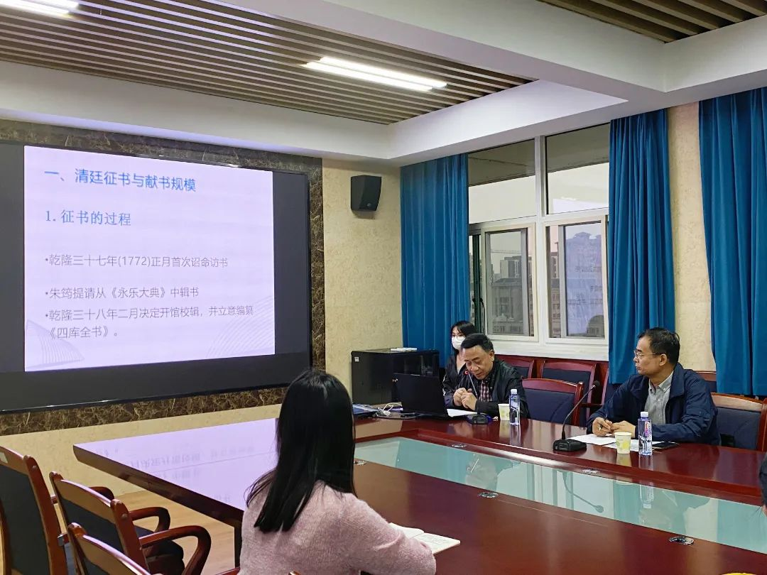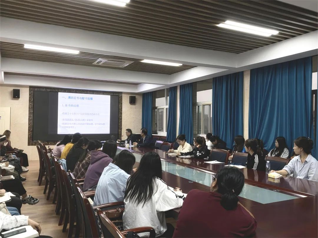 全体师生对周少川教授的到来表示热烈的欢迎。讲座主要分为清廷征书与献书规模,藏书家襄助《四库全书》的事迹两部分内容。首先,周教授向全体师生详细地介绍了乾隆年间《四库全书》征书的过程以及乾隆帝访求图书时的策略。接着,周教授通过表格的形式,展示了献书前十名藏书家收藏的书籍种数、籍贯和身份等信息,尤其是对各省献书前十名情况的讲解,为我们了解当时的献书规模提供了强有力的客观依据,也体现了周少川教授严谨求实的学术态度。
