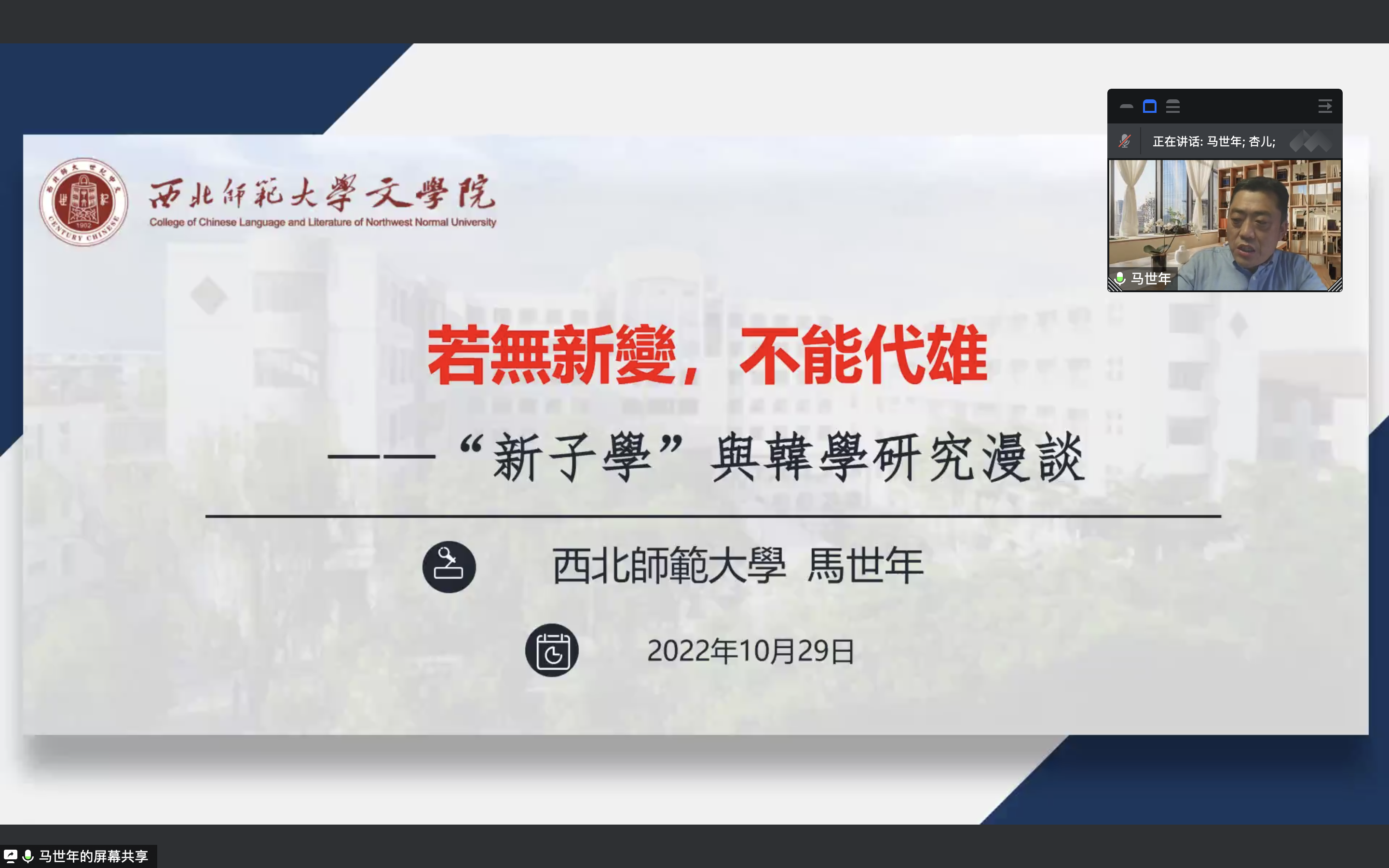 在腾讯会议平台成功举办了题为“若无新变,不能代雄——新子学与韩学研究刍论”的学术讲座。讲座特邀西北师范大学澳门永利皇宫