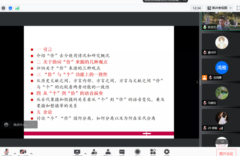 于腾讯会议平台举行了题为“论助词‘价’源于‘个’”的学术讲座。本次讲座特邀北京语言大学语言资源研究所所长,博士生导师,中国语言资源保护研究中心研究员张世方老师主讲。讲座由人澳门永利皇宫