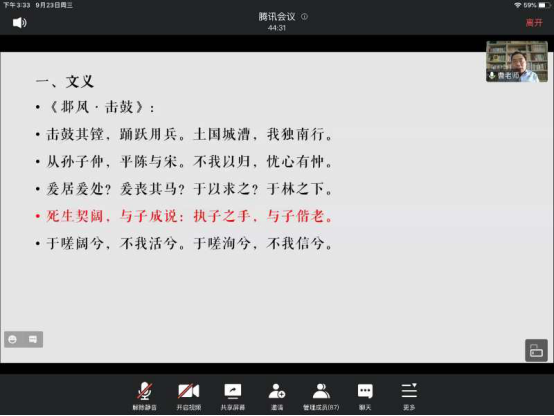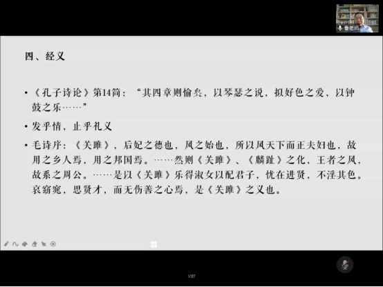 于腾讯会议平台举行了题为“《诗经》的礼义、乐义与诗义”的讲座。讲座特邀陕西师范大学澳门永利皇宫