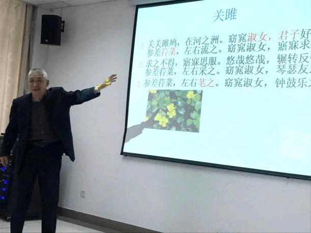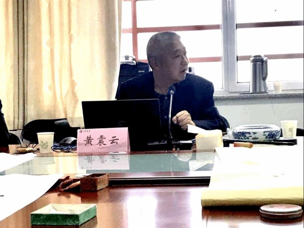题“博学慎思”等字。讲座伊始,黄教授介绍了现有文学研究工作的几种模式。随后,黄老师就文学研究的转型建设方向进行细致讲解,他指出传统的文献学及文学研究正面临大数据和智库的挑战,作为新时期的文学工作者,首先要关心最新科技,重视学科交叉。其次,要转变研究视角,重新审视传统文学命题。黄老师强调真正有价值的文学,要解决现实问题,回答现实问题,因此要明确文学研究的价值指引,重新划分文学的边界,让文学成为民族复兴的精神力量。此后,黄震云教授就文学与其他学科的交叉研究方法提出了可行的六种方向,分别为历史、文化、文学、考古、时代及思想,并佐以丰富详实的案例,如黄教授以《诗经》中的首篇《关雎》为例,以“参差荇菜”的女子比喻义,“采”与“芼”的古今义之别,及“琴瑟”“钟鼓”等词所指代的日常生活与重大场合等知识,生动展示了古今文化之别所带来的认知差异,指出其中学术可行之处。