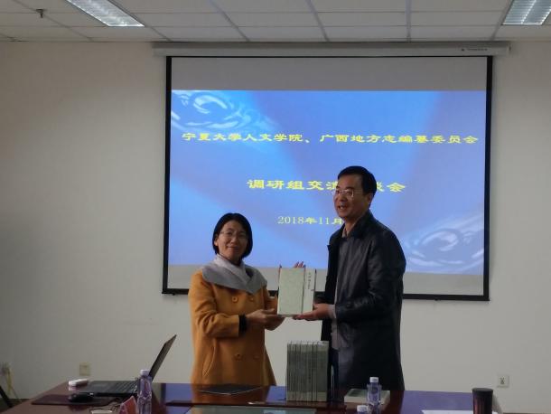 的成立与发展概况,详细说明了宁夏古文献整理、自治区人文科学重点基地及国家社科重大基金项目《朔方文库》编纂、出版等工作的基本情况。黄南津教授就调研的主要内容,特别是《广西历代方志集成》研究内容等基本情况进行了介绍。张爱芳进一步补充了当前全国地方志的研究状况。