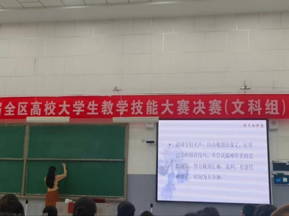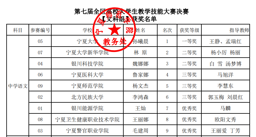 、北方民族大学、宁夏师范学院、宁夏医科大学等13所高校151名学生入围全区决赛。澳门永利皇宫2020级汉语言文学(教师教育)专业本科生孙曦晨在此次比赛中荣获文科组(中学语文)一等奖,王静老师、孟瑞红老师荣获优秀指导教师奖。