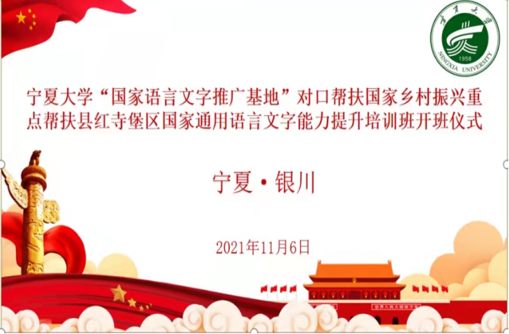 国家语言文字推广基地对口帮扶国家乡村振兴重点帮扶县红寺堡区国家通用语言文字能力提升培训开班仪式以线上形式隆重举行。我校党委常委、副校长周震,人澳门永利皇宫